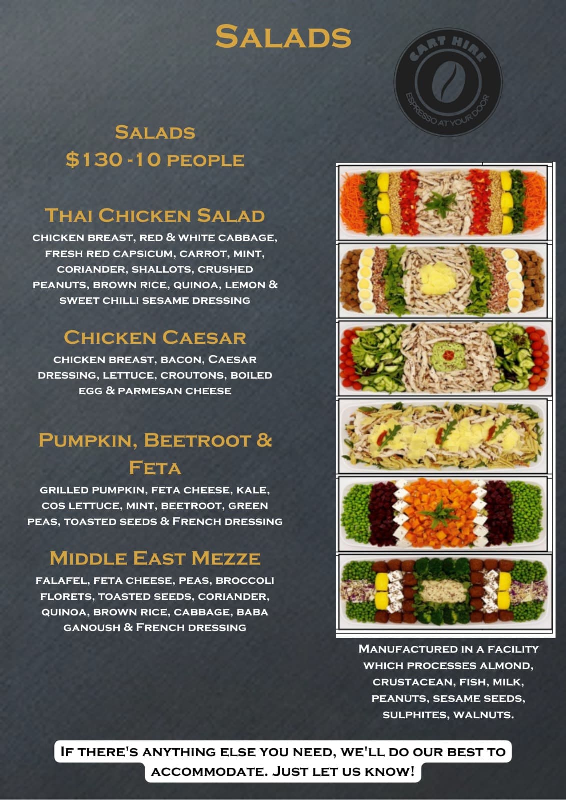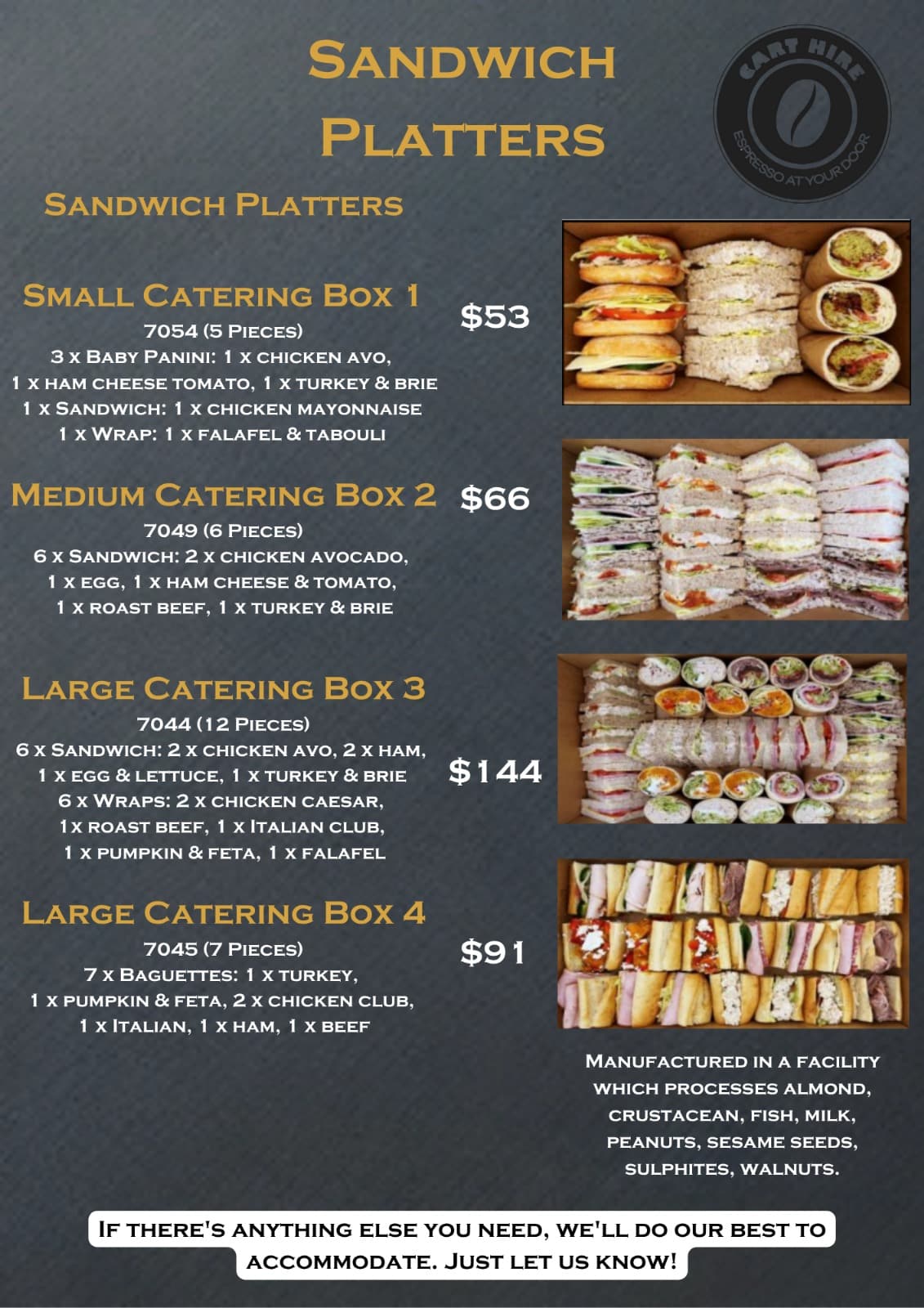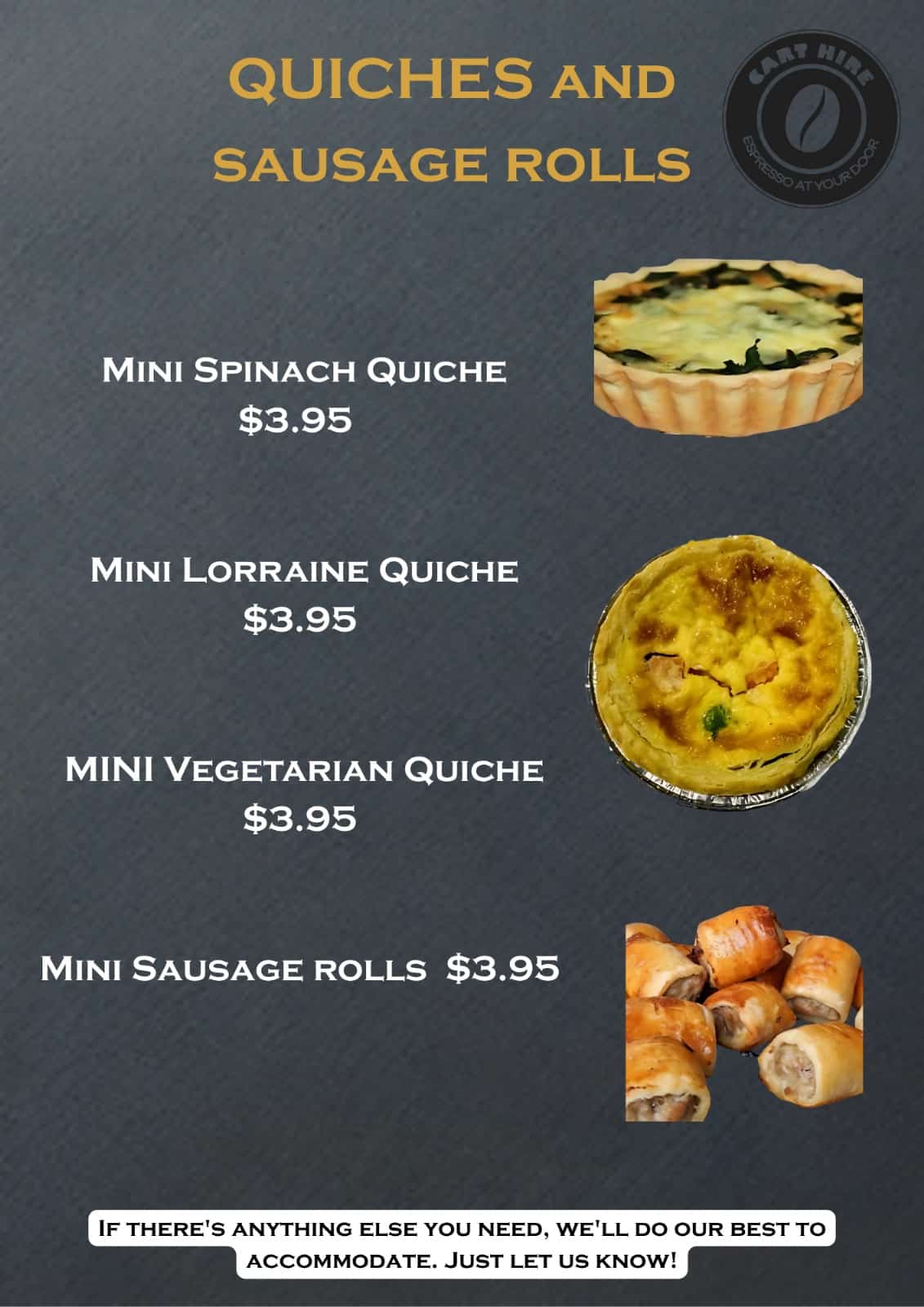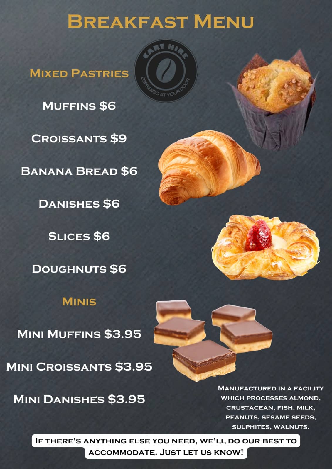 There is no minimum volume required when adding these catering options to our Coffee Cart Hire services and we can make recommendations at your request. We believe all events should not be limited especially when we can use our contacts to take the headache out of the way for you.