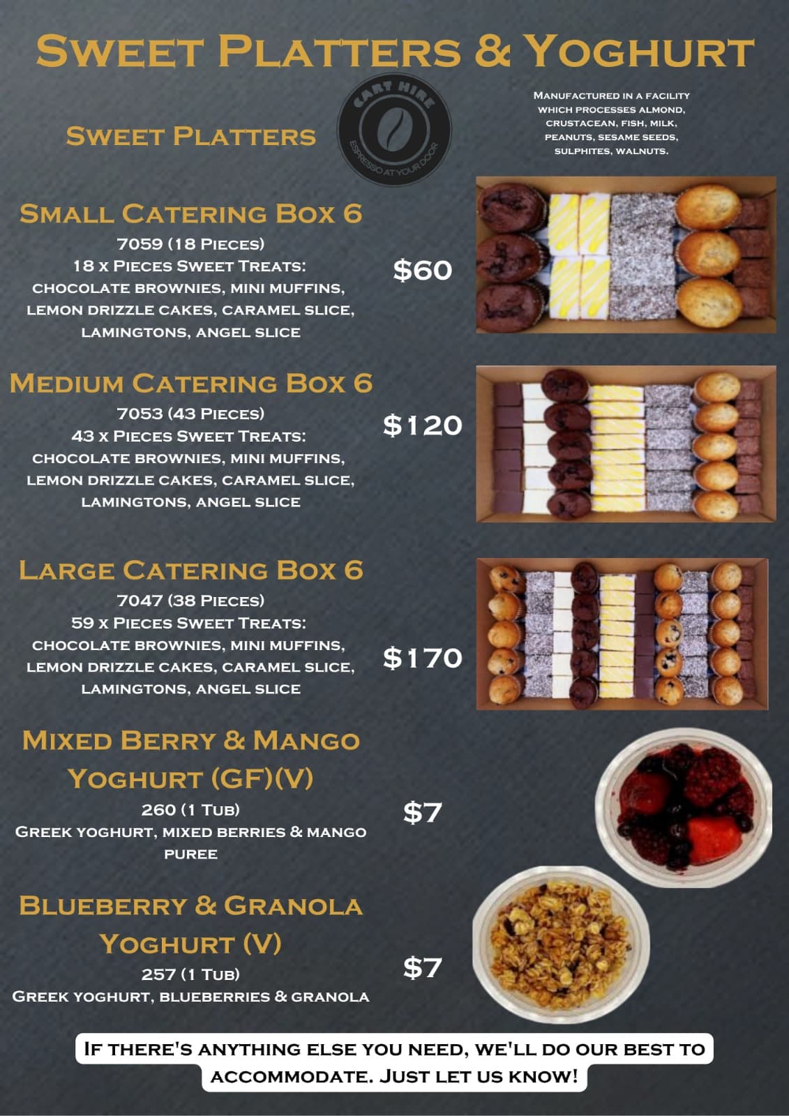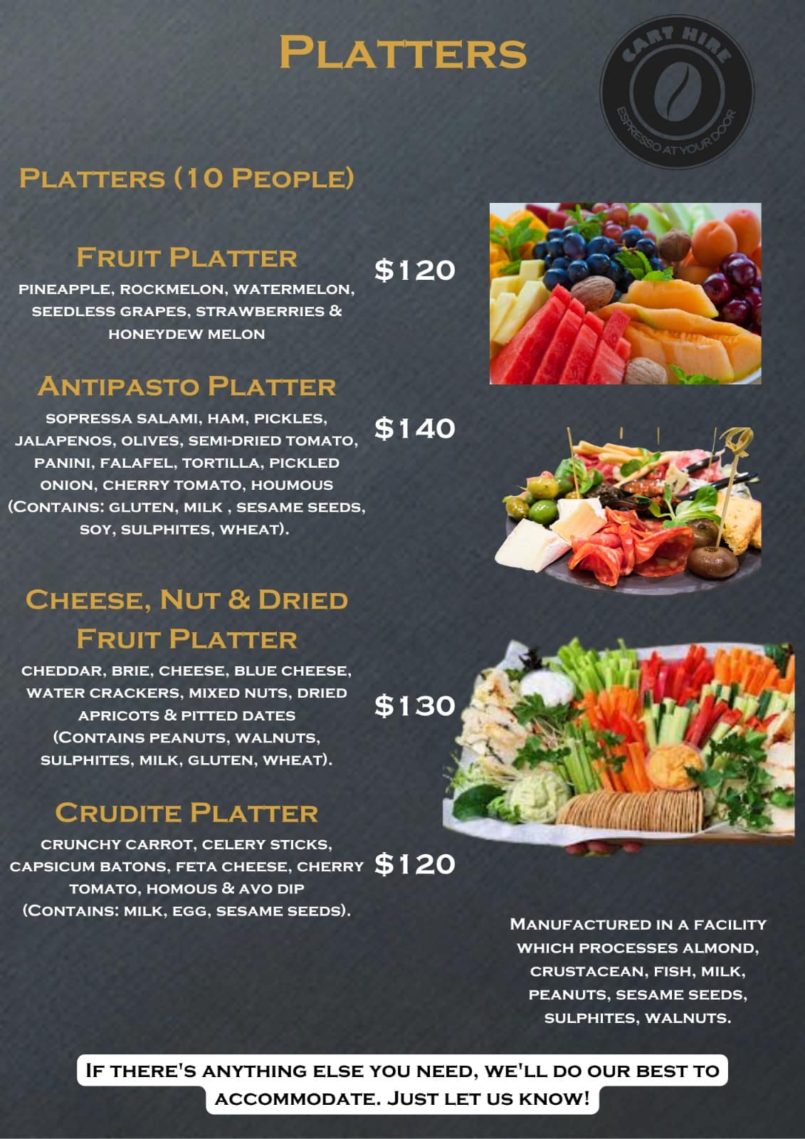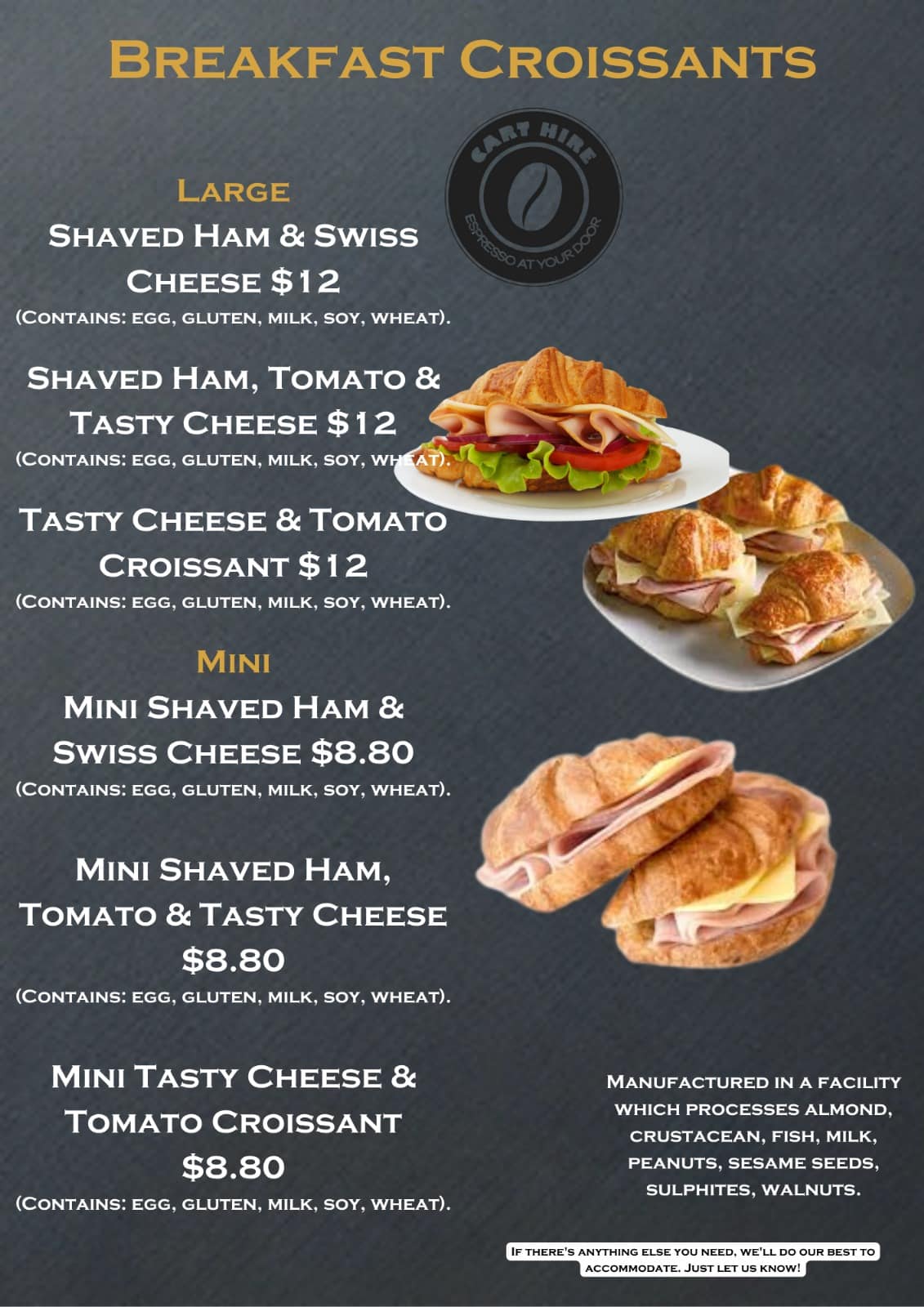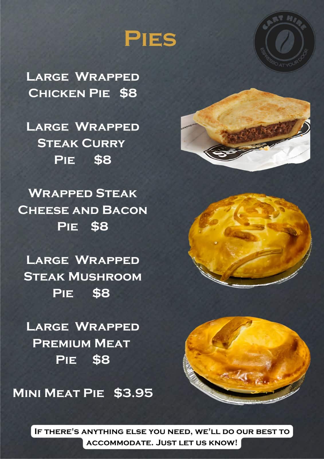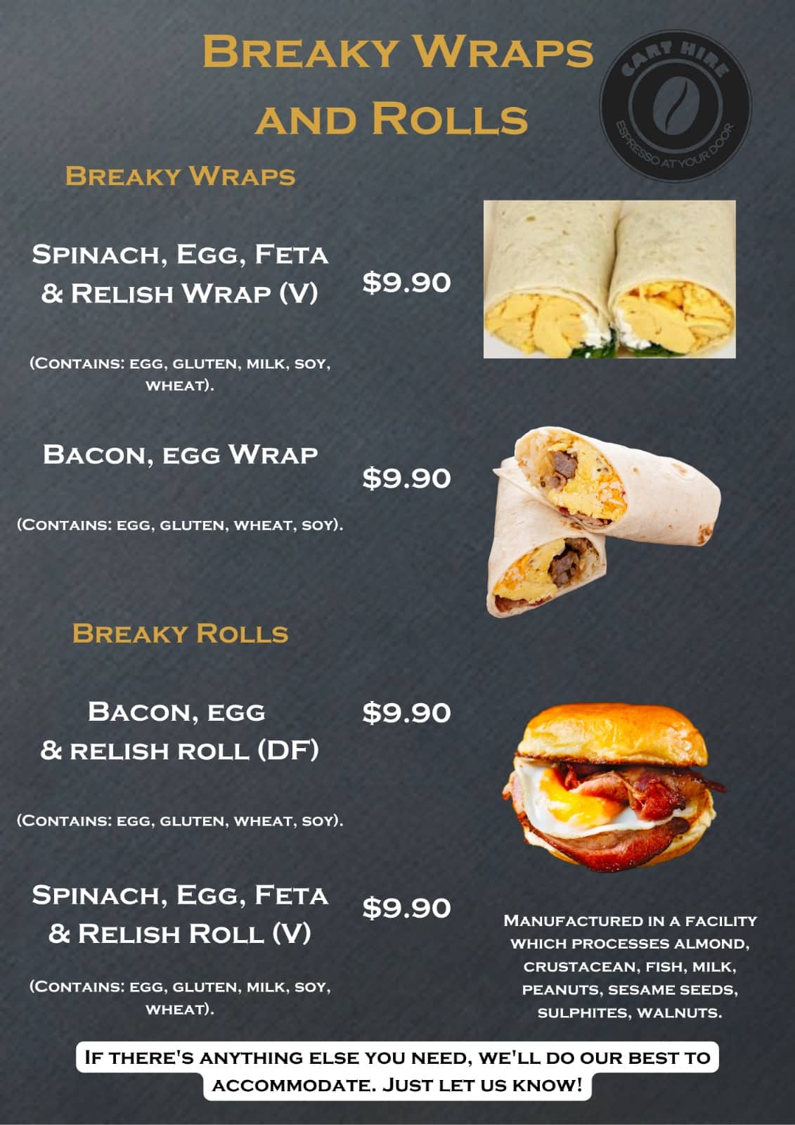 There is no minimum volume required when adding these catering options to our Coffee Cart Hire services and we can make recommendations at your request. We believe all events should not be limited especially when we can use our contacts to take the headache out of the way for you.